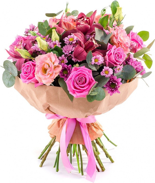 1 орхидея цимбидиум, 1 розовая роза, 1 эустома, 1 хризантема, эвкалипт, упаковка, лента2 орхидеи цимбидиум, 3 розовых розы, 2 эустомы, 2 хризантемы, эвкалипт, упаковка, лента3 орхидеи цимбидиум, 5 розовых роз, 3 эустомы, 5 хризантем, эвкалипт, упаковка, лента